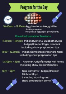 The eggs that birds lay during the show are the property of the owner of that bird. Anyone caught taking eggs from pens during the show and are not the owner of that bird will be dealt with by the police.