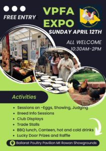The VPFA will host an expo on Sunday 12th April at Ballarat. The exact agenda is being finalised but will likely include breed seminars, a discussion on judging and general information on exhibition poultry. The agenda will be finalised soon and advertised widely.